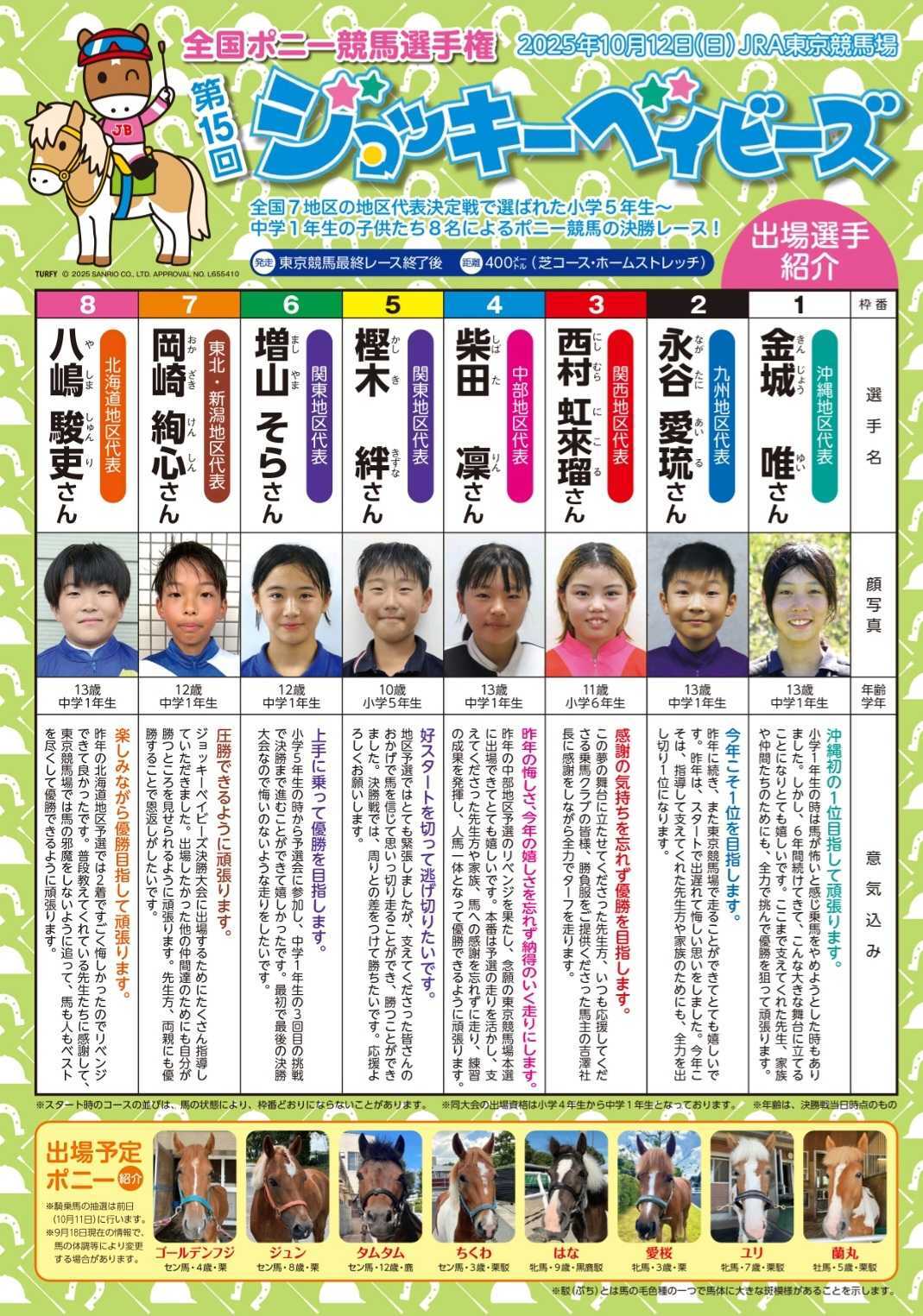 10月12日(日)、最終レース終了後の東京競馬場、芝直線400mで、全国ポニー競馬選手権「第15回ジョッキーベイビーズ」が開催されます。