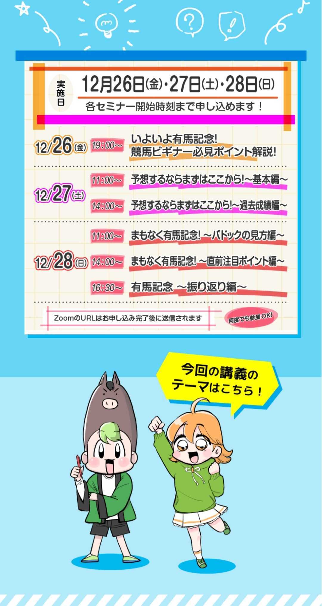 当日のホープフルS、阪神C、中山大障害と、翌日の有馬記念について、たっぷりお話を聞いていきます。もちろん、観覧は無料!